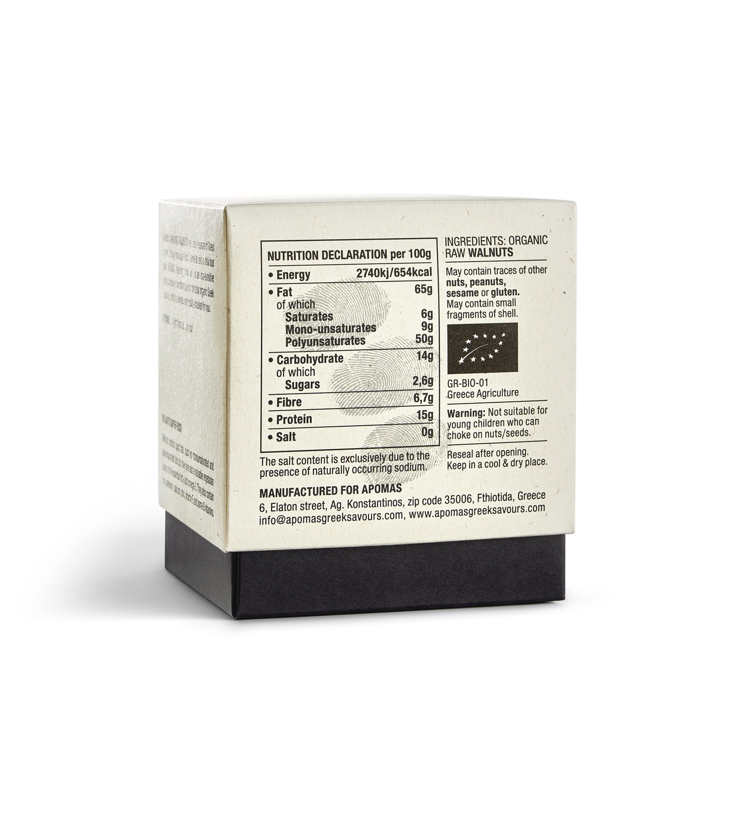Πολύτιμος σύμμαχος της καρδιάς και γενικότερα της υγείας, είναι διπλά ωφέλιμα και γευστικά λόγω της βιολογικής τους καλλιέργειας. Από πιστοποιημένες καλλιέργειες γεμίζουμε χάρτινους ανακυκλωμένους κύβους με ωφέλιμες «πεταλούδες». Τα ωμά καρύδια, εξαιρετικά θρεπτικά, χωράνε παντού: στη χούφτα, στο μπολάκι του δεκατιανού, στη διάθεση!